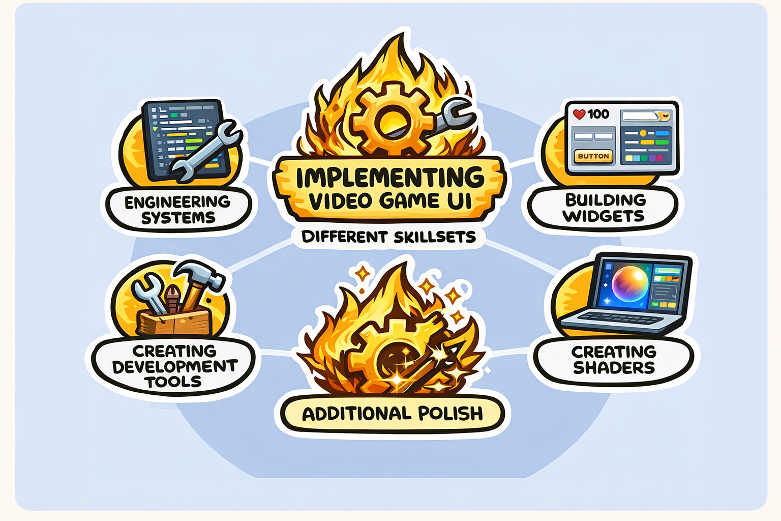 Implementation is the complex process of taking designer concepts and turning them into real-world gameplay. It’s a broad term for a broad skillset.
